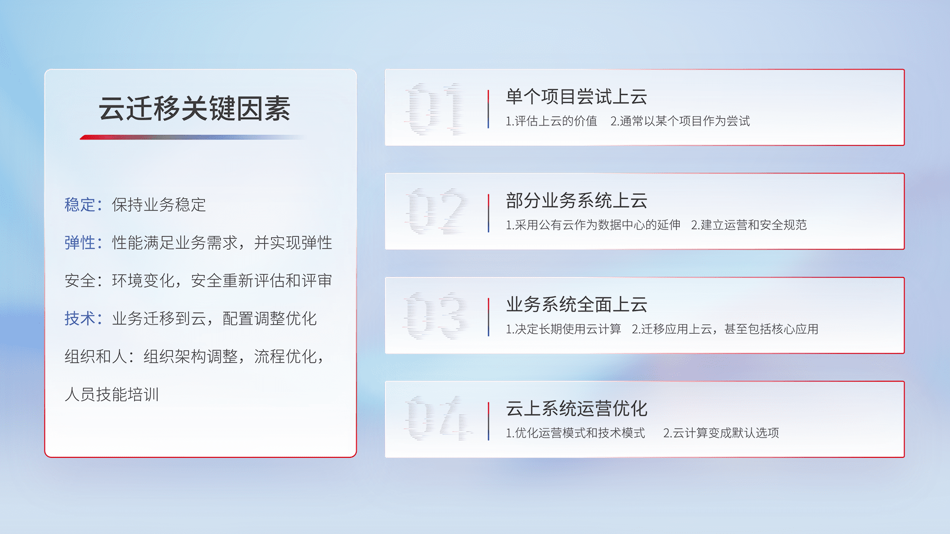 结合实际业务,,从规划设计、、、云平台选型、、云原生改造、、数据迁移、、、集成交付,,,,迁移全过程为客户识别最佳上云路径,,做好风险识别管理,,,,设计网络架构、、、身份权限、、、安全审计合规、、、、操作审计、、、、日志审计、、、、监控告警策略、、、多站点容灾设计等,,对云上基础设施进行整体规划,,,,提升IT治理水平,,以满足弹性、、高可用、、、高性能的需求。。。