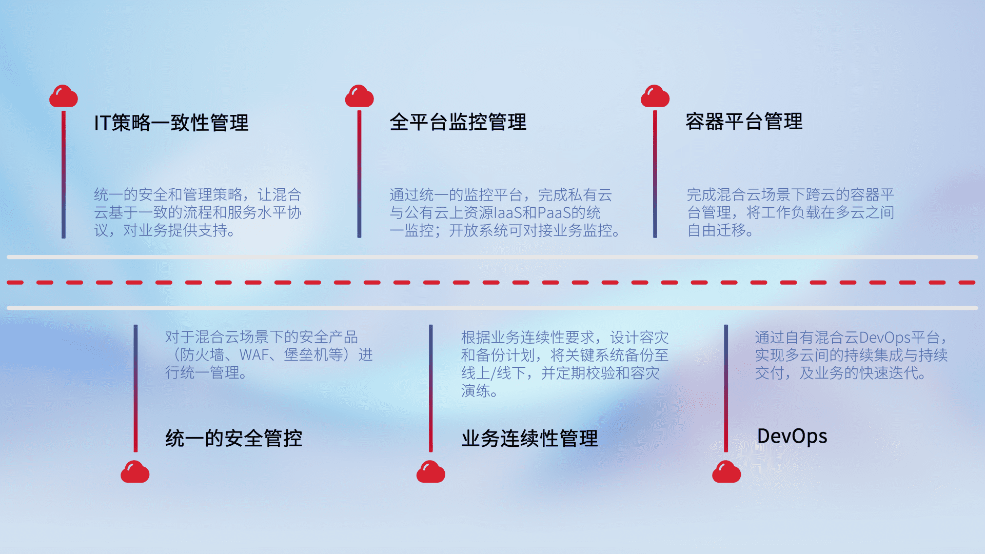通过多云纳管,,,,以统一的资源数据模型把客户的云资源进行抽象和封装,,,进而实现对多云资源的统一操作,,,,保障云资源管理的可靠性、、、稳定性与可用性。。。。量身定制化运维内容,,,配置、、、开发运维、、、、补丁管理、、备份、、监控、、、、认证和访问管理、、、审计和日常巡检等,,保障在用云过程中的可靠度,,稳定度以及高可用率。。。