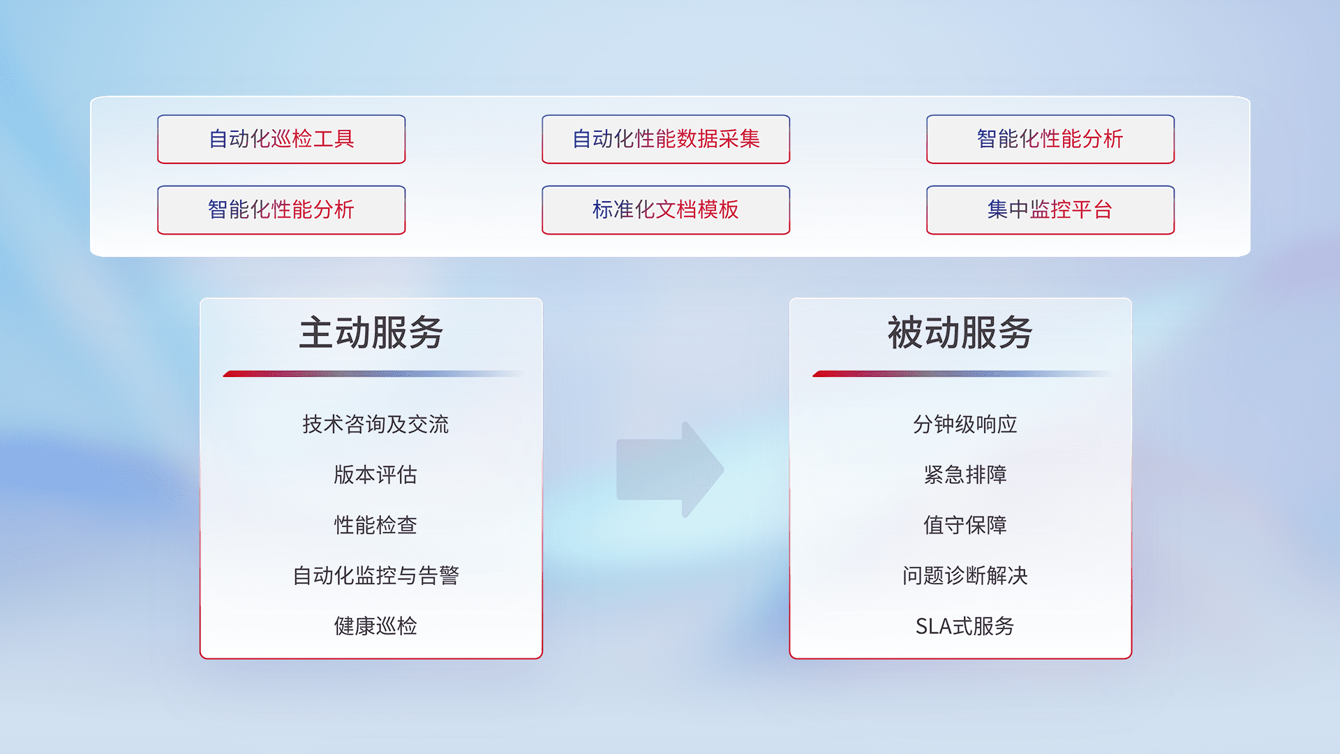 智能化工具和标准化文档,,,,保障服务质量,,,提供主动服务(包含技术咨询、、、版本评估、、、、性能检查、、、、自动化监控与告警、、、、健康巡检)和被动服务包含(分钟级响应、、、、紧急排障、、、、值守保障、、问题诊断解决、、、SLA服务)。。。