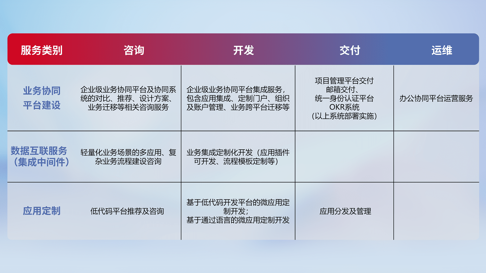针对钉钉、、企微、、、、IDaas等平台级产品提供产品的规划、、、方案、、、、交付、、、定制化开发等服务,,实现如统一协同办公、、、、智能客户服务、、混合会议管理、、、、智能数据查询、、、、等业务场景,,,,实现数字化转型。。。